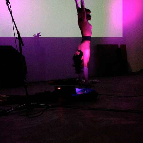 Among many possible readings of this conceptually rich work, I’m most drawn to the mode of sophisticated, and distinctly feminist/queer, meditation it offers on the discourse of self-love. We sometimes forget that in the myth of Narcissus, it isn’t mere arrogance that leads him to choose himself as love object but rather misrecognition of his reflection for another. Instead of the kind of entitled and self-conscious strutting that we so often label as narcissistic in our culture of ubiqutous Facebook selfies and incessant documentation of self-pampering vacations and dining experiences, Narcissus forgets himself completely and eventually dies from this self-neglect. Narcissister’s auto-erotic, and decidedly campy, reenactment of Narcissus’s attempt to caress his own image with her own body’s looping contortions reintroduce a much needed complexity to our examination of the framework of narcissism as she asks us to ponder the meaning, and even radical possibilities, of true self-love.