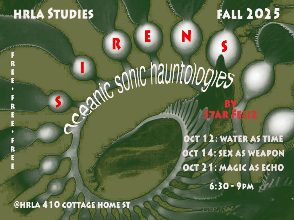 What is submerged always endures, often returning with a piercing sound. Sirens is a series on marine, sound, mythology, theory, and ritual across the primarily Black Atlantic. Through readings, presentations, conversations, and guided meditations, we’ll experiment with ideas of time and its relationship to suppressed lineages, endangered ecologies, and feminine performativity.